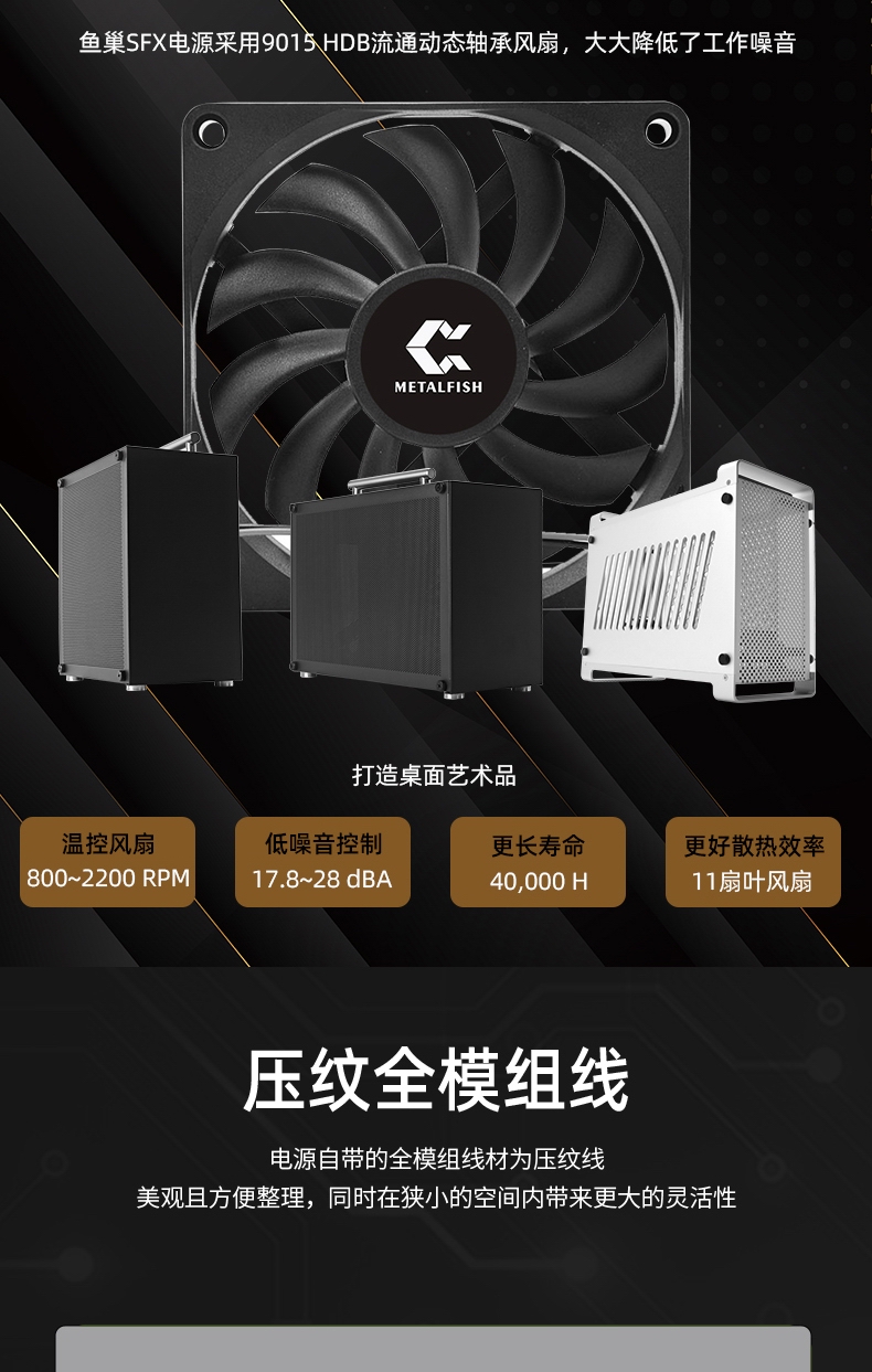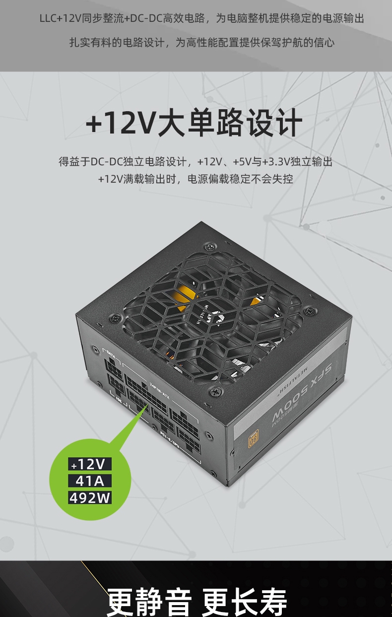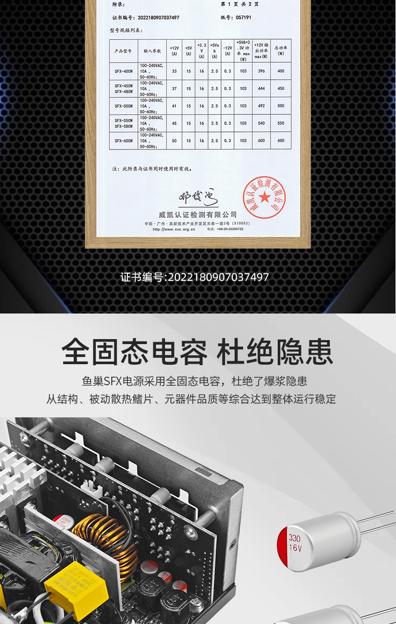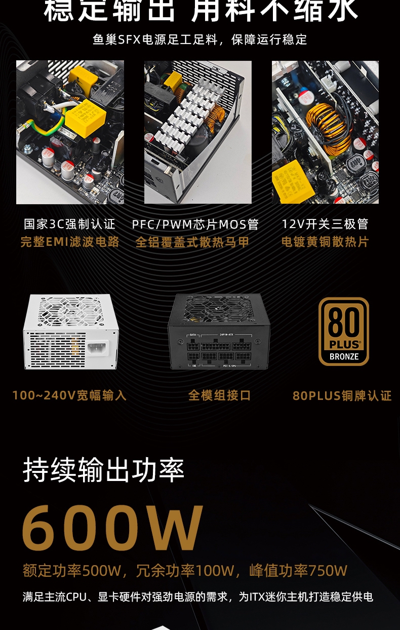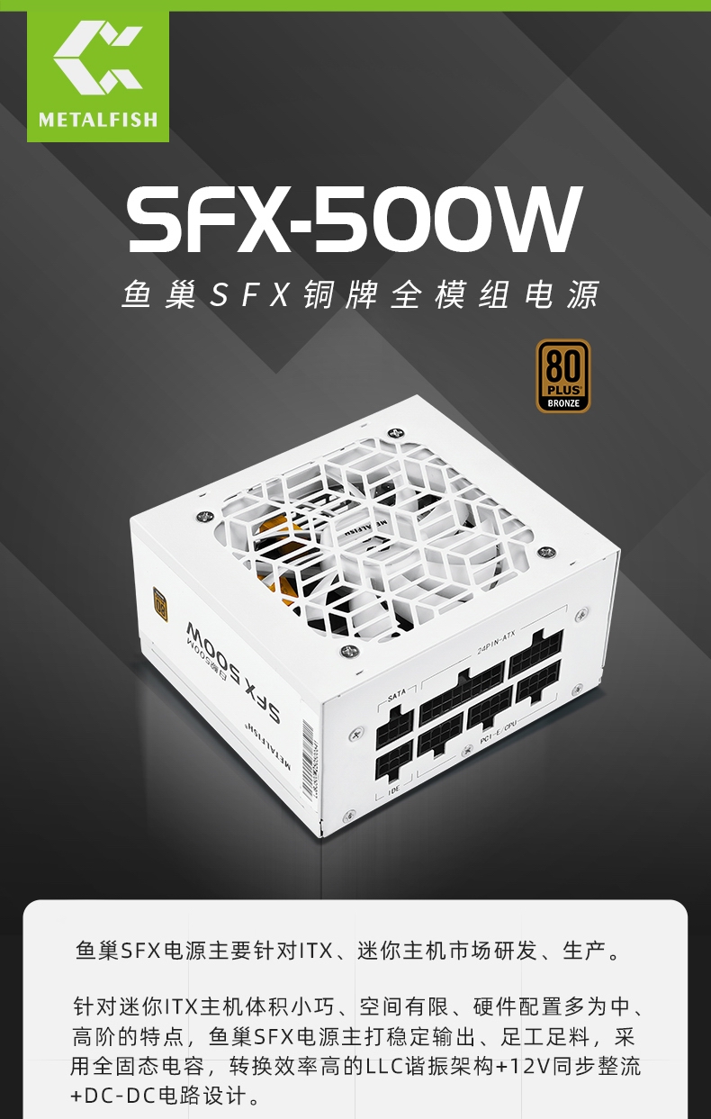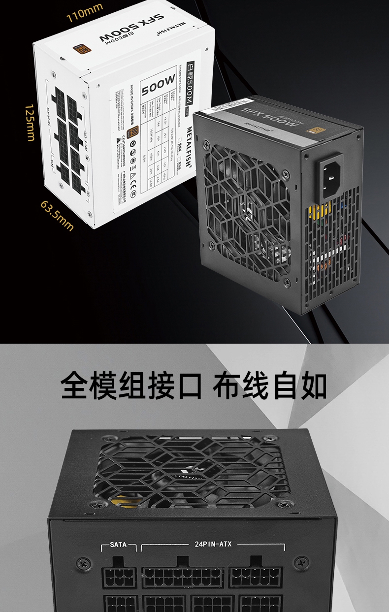 SFX-500W电源额定输出500W,峰值输出600W,支持100-240V宽幅输入,电源分为全模组版和直出线版,具备88%转换效率,体积小巧、用料扎实、工艺精湛,温控散热。
